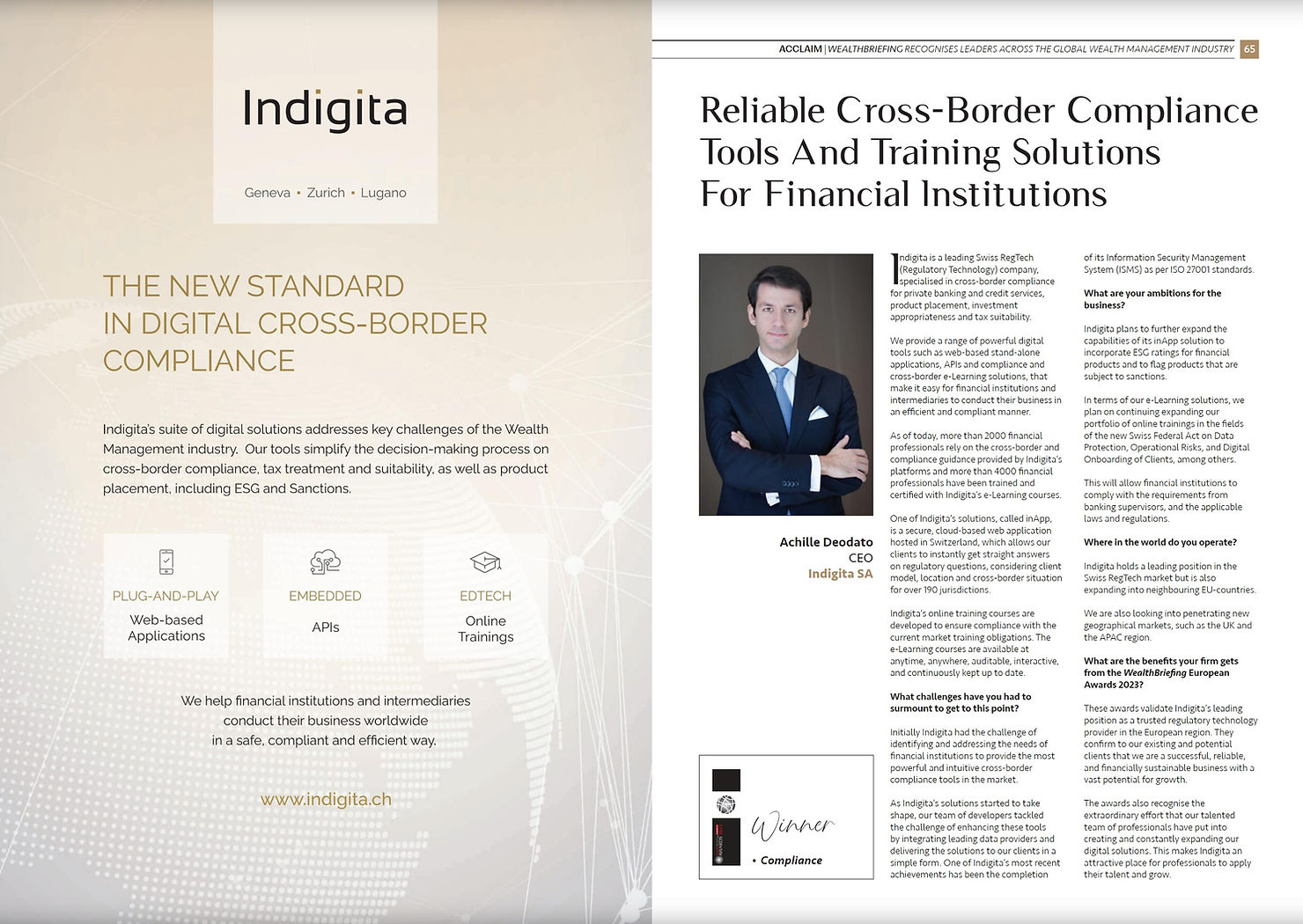 In this interview with Acclaim Magazine, Achille Deodato, CEO of Indigita, reflects on the financial industry trends, company’s journey and its rise as a prominent regulatory technology (RegTech) provider. He discusses how Indigita has become a leader in offering integrated cross-border compliance solutions and in leveraging strategic partnerships to empower financial institutions worldwide.