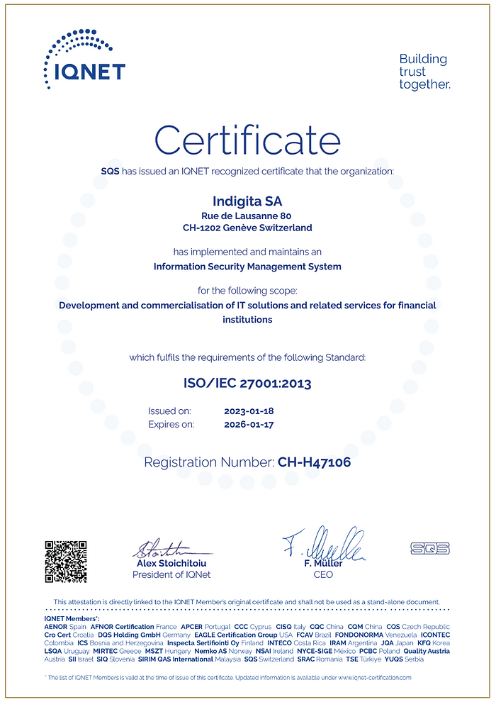 Swiss regtech company Indigita SA successfully completed the ISO/IEC 27001:2013 certification. The global standard specifies the requirements for establishing, implementing, maintaining and continually improving an information security management system, and represents the most well-known standard in this field.