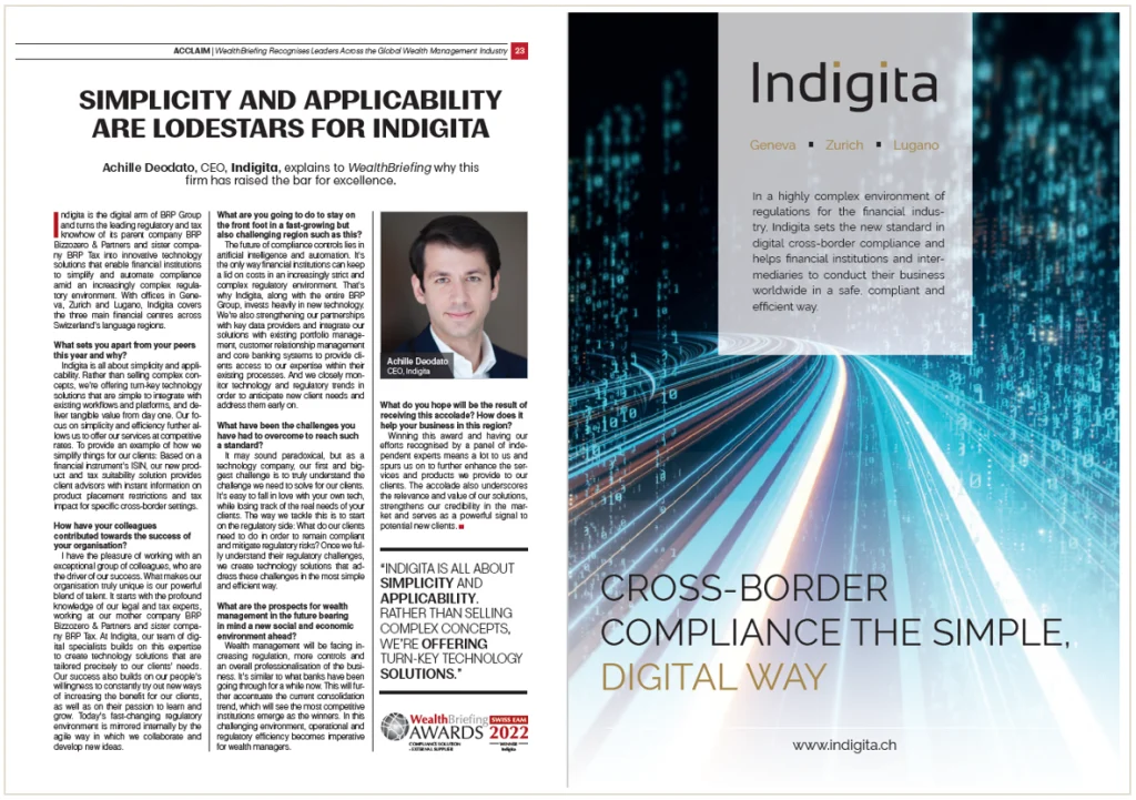 Indigita is the digital arm of BRP Group and turns the leading regulatory and tax knowhow of its parent company BRP Bizzozero & Partners and sister company BRP Tax into innovative technology solutions that enable financial institutions to simplify and automate compliance amid an increasingly complex regulatory environment. With offices in Geneva, Zurich and Lugano, Indigita covers the three main financial centres across Switzerland’s language regions.