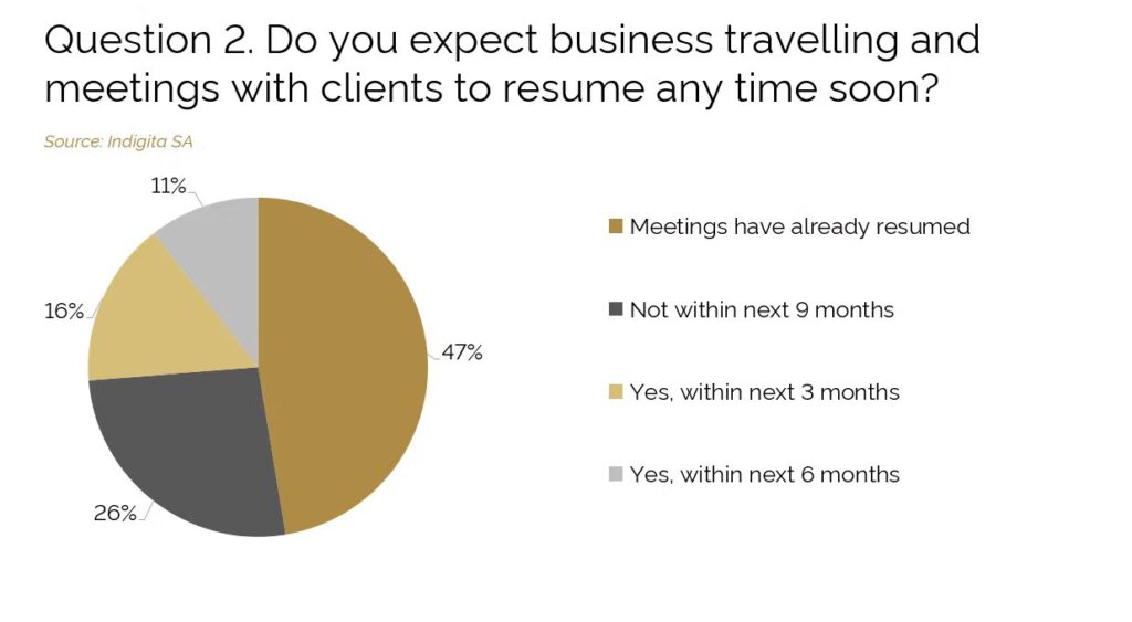 While 47% of those surveyed stated that they have already resumed travelling and meeting clients for business, this has not been the case for over 50% of those questioned.