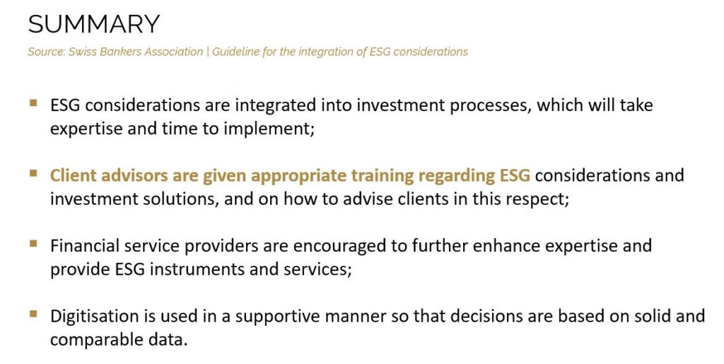 For instance, the SBA’s “Guideline for the integration of ESG considerations into the advisory process for private clients” recommends financial service providers to ensure that their client advisors are adequately trained in ESG considerations. In addition to general expertise about the financial services and products offered to clients, client advisors should be able to address the risks and opportunities related to Sustainable Investments and the intended effect of such an investment (e.g.: “How does investing in a specific financial product address issues related to climate change?”).