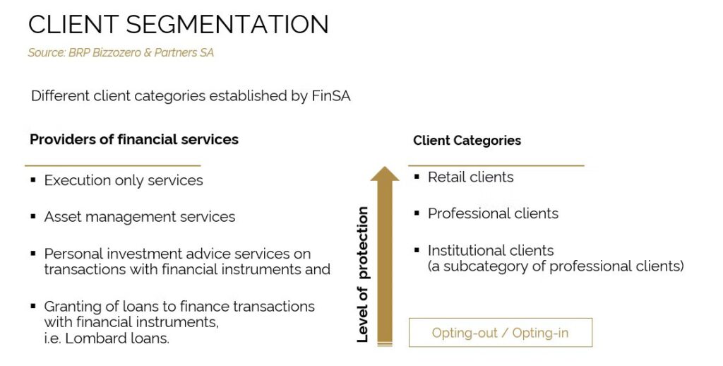 The highest level of protection applies to retail clients and the lowest level of protection to institutional clients. To them, FinSA rules of conduct do not apply. Depending on the client category, clients may declare under certain conditions that they want to change segment, by increasing their protection (the so-called opting in) or reducing their protection (the so-called opting out).
